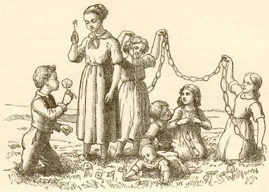 Og hen over Marken kom en heel Skare Børn: det mindste af disse var nu saa lillebitte, at det blev baaret af de andre; og da det blev sat i Græsset mellem de gule Blomster, loe det høit af Glæde, sparkede med de smaa Been, væltede sig omkring, plukkede kun de gule Blomster og kyssede dem i sød Uskyldighed. De noget større Børn brød Blomsten fra den hule Stilk, bøiede denne rundt ind i sig selv, Led ved Led, en heel Kjæde blev det; først een til Halsen, saa een at hænge om Skulderen og om Livet, paa Brystet og paa Hovedet; det var en heel Pragt af grønne Lænker og Kjæder; men de største Børn tog forsigtig den afblomstrede Urt, Stilken, der bar dens fnugartede sammensatte Frø-Krone, denne løse luftige Uldblomst, det er et heelt lille Kunststykke, som af de fineste Fjer, Fnug eller Duun; de holdt den ved Munden for i eet Pust at afblæse den heelt; den, der kunde det, fik nye Klæder, før Aaret var omme, havde Bedstemoder sagt.