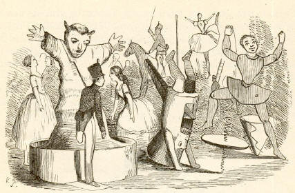 Paa Bordet, hvor de bleve stillede op, stod meget andet Legetøi; men det, som faldt meest i Øinene, var et nydeligt Slot af Papir. Gjennem de smaa Vinduer kunde man see lige ind i Salene. Udenfor stode smaa Træer, rundtom et lille Speil, der skulde see ud som en Sø; Svaner af Vox svømmede derpaa og speilede sig. Det var altsammen nydeligt, men det Nydeligste blev dog en lille Jomfru, som stod midt i den aabne Slotsdør; hun var ogsaa klippet ud af Papir, men hun havde et Skjørt paa af det klareste Linon og et lille smalt blaat Baand over Skulderen ligesom et Gevandt; midt i det sad en skinnende Paillette, lige saa stor som hele hendes Ansigt. Den lille Jomfru strakte begge sine Arme ud, for hun var en Dandserinde, og saa løftede hun sit ene Been saa høit i Veiret, at Tinsoldaten slet ikke kunde finde det og troede, at hun kun havde eet Been ligesom han.
