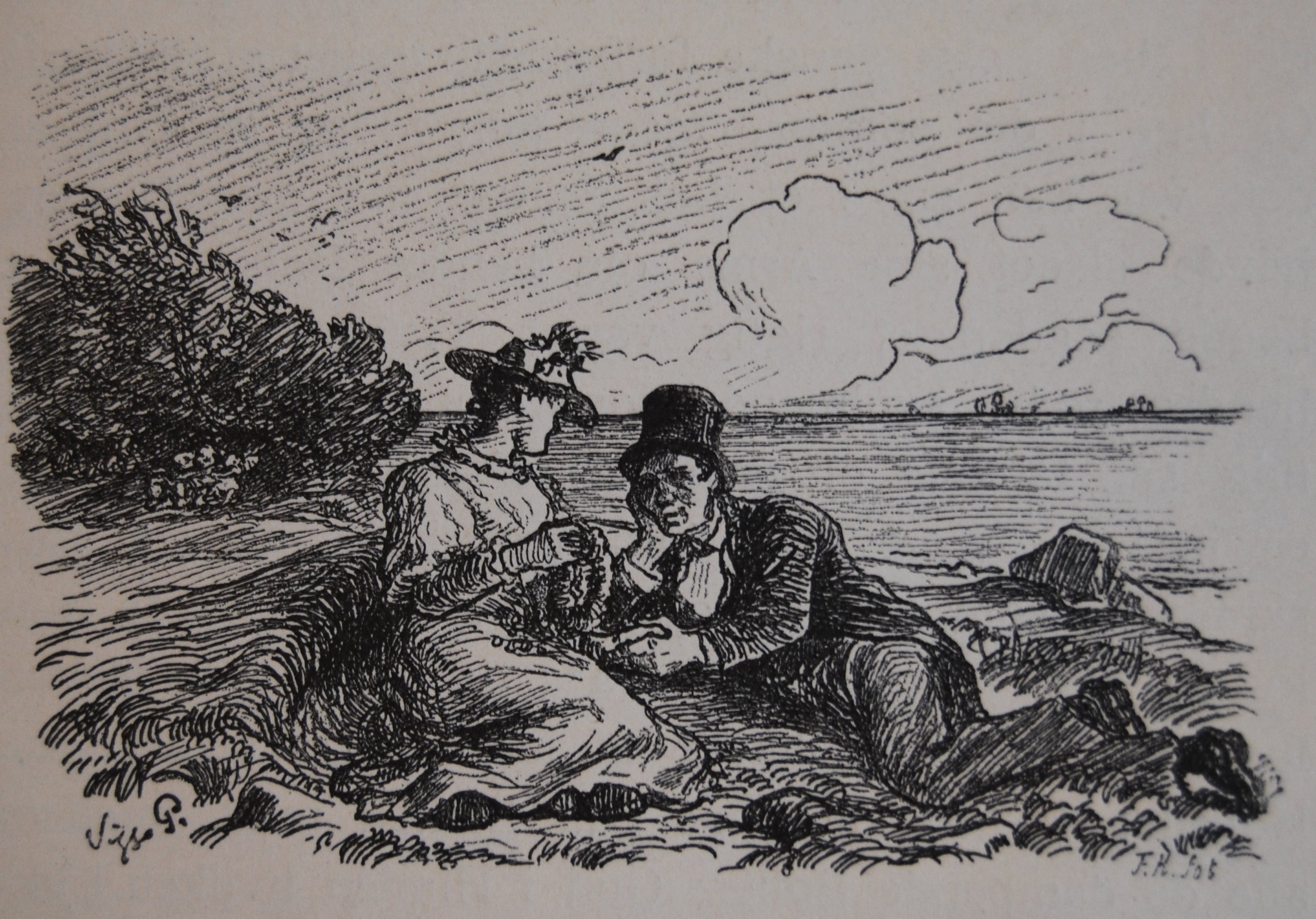 saa hans høje, hvælvede Pande og "Polkahaaret",