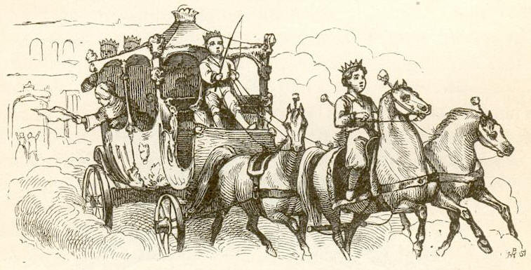Og hun fik baade Støvler og Muffe; hun blev saa nydeligt klædt paa, og da hun vilde afsted, holdt ved Døren en ny Karreet af puurt Guld; Prindsens og Prindsessens Vaaben lyste fra den som en Stjerne; Kudsk, Tjenere og Forridere, for der vare ogsaa Forridere, sade klædte i Guldkroner. Prindsen og Prindsessen hjalp hende selv i Vognen og ønskede hende al Lykke. Skovkragen, der nu var bleven givt, fulgte med de første tre Mile; den sad ved Siden af hende, for den kunde ikke taale at kjøre baglænds; den anden Krage stod i Porten og slog med Vingerne, den fulgte ikke med, thi den leed af Hovedpine, siden den havde faaet fast Ansættelse og for meget at spise. Indeni var Karreten foret med Sukkerkringler, og i Sædet vare Frugter og Pebernødder.