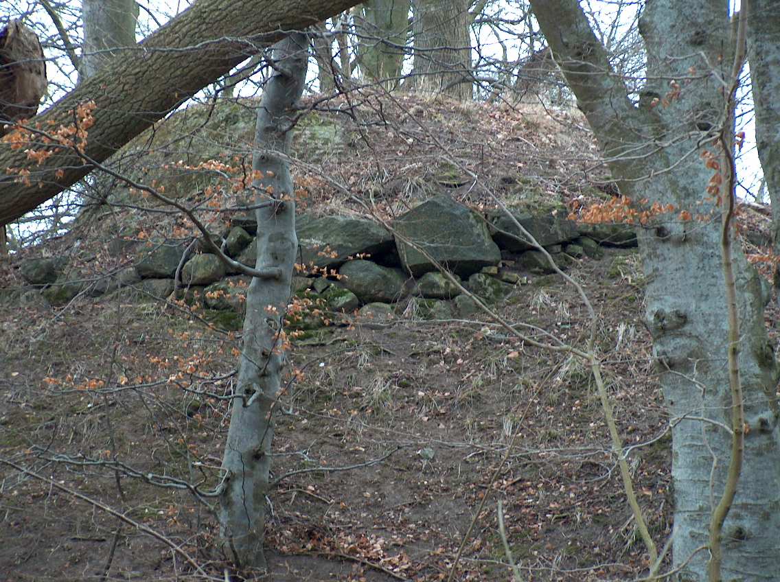 Iskælderen kan i dag ses i landskabet som en høj, der ligger tæt ved vejen som går rundt om Glorup. Tidligere var der et bindingsværks lysthus oven på . Foto: Lars Bjørnsten marts 2003 |