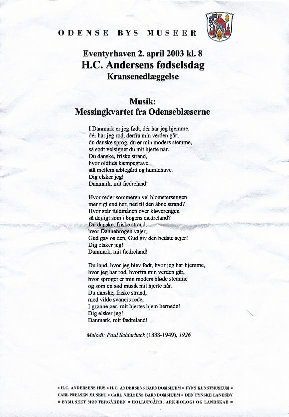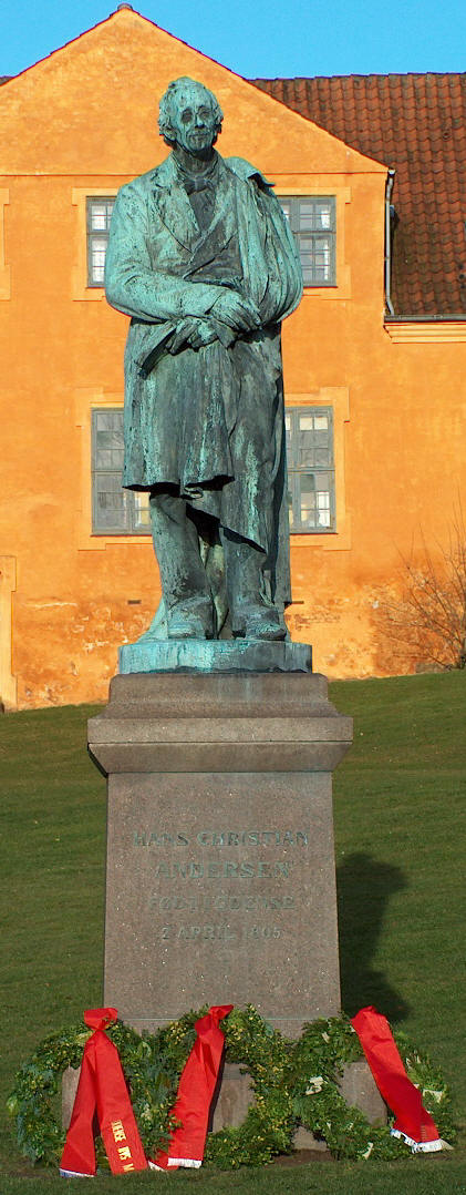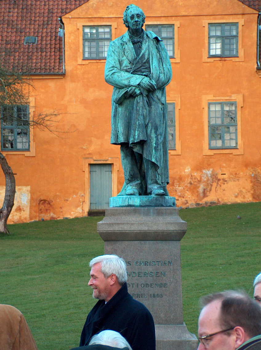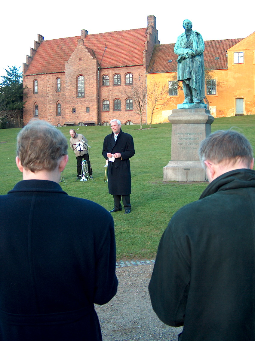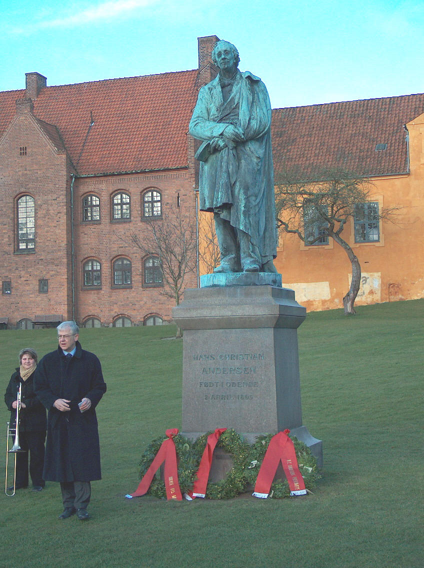 Andersen Haven i Odense 2. april 2003 kl. 8 H.C. Andersens fødselsdag Kransenedlæggelse ved Hasselriis' statue af Hans Christian Andersen