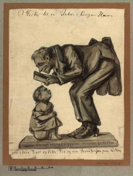 The text on the drawing reads: (above) "Skitze til en Statue i Kongens Have" (below) " en store Fjært og lille Fis og om Prinsessen på Potten.".